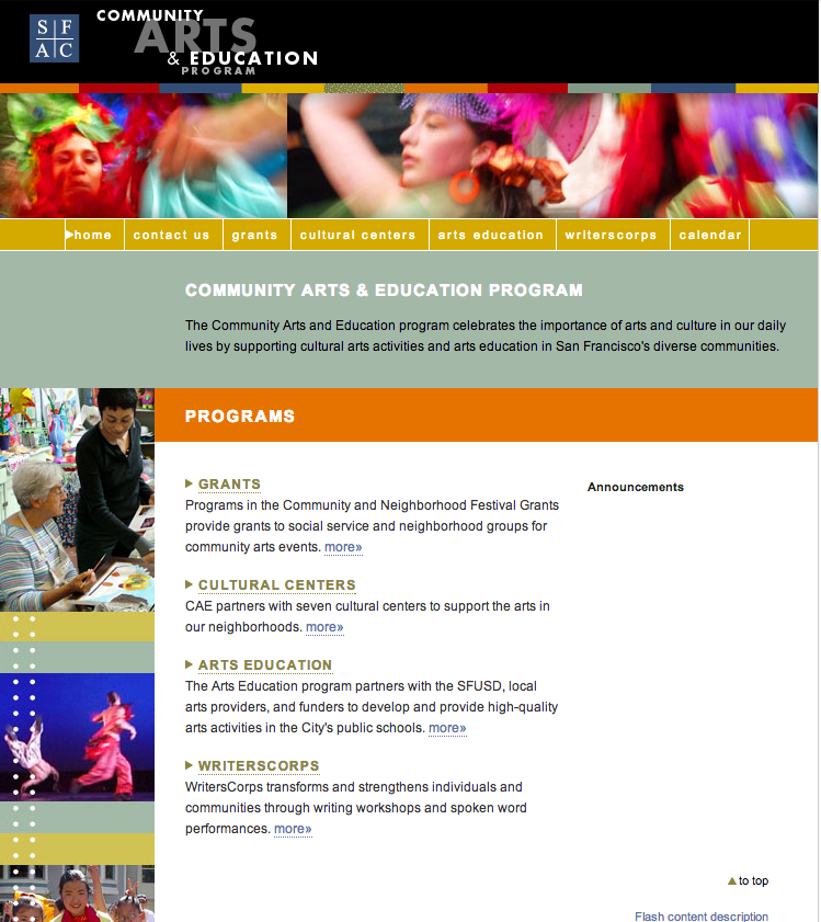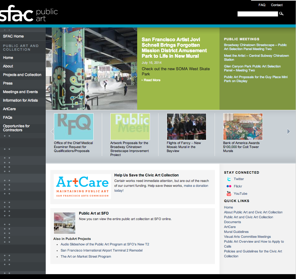 The Arts Commission is the City department that promotes the arts through grants, galleries, public art and artist resources. As the design and technology manager, I oversaw projects that aimed to unite the disparate arts programs. One of the biggest hurdles was to merge all of the sites into a consistent brand with a clean navigation and easy access to artist opportunities.