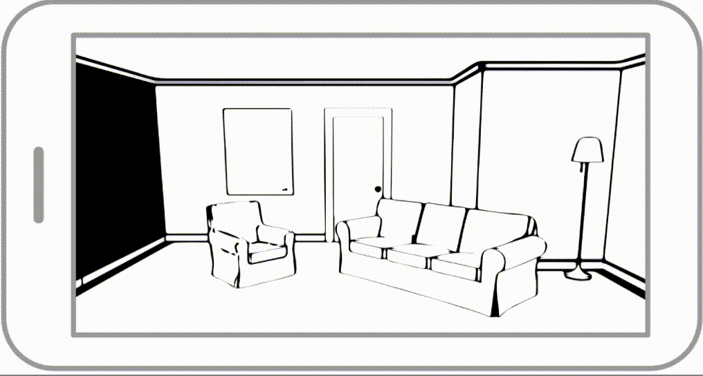 Solution: Pinch and zoom to move in and out, tap shows and reveals tools, and single finger drag rotates the room.