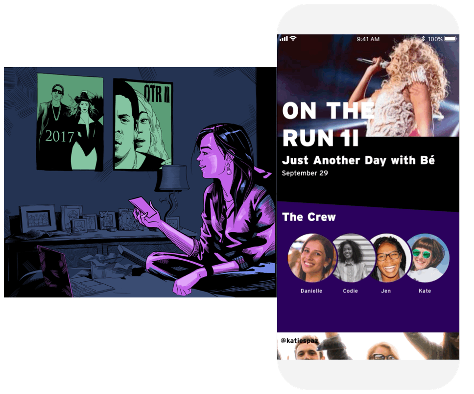 Danielle gets a notification of exclusive content for ticket holders. The event page has transformed into the Hype Room. It is personalized with her friends who are going, playlists, and video from previous shows on the tour.