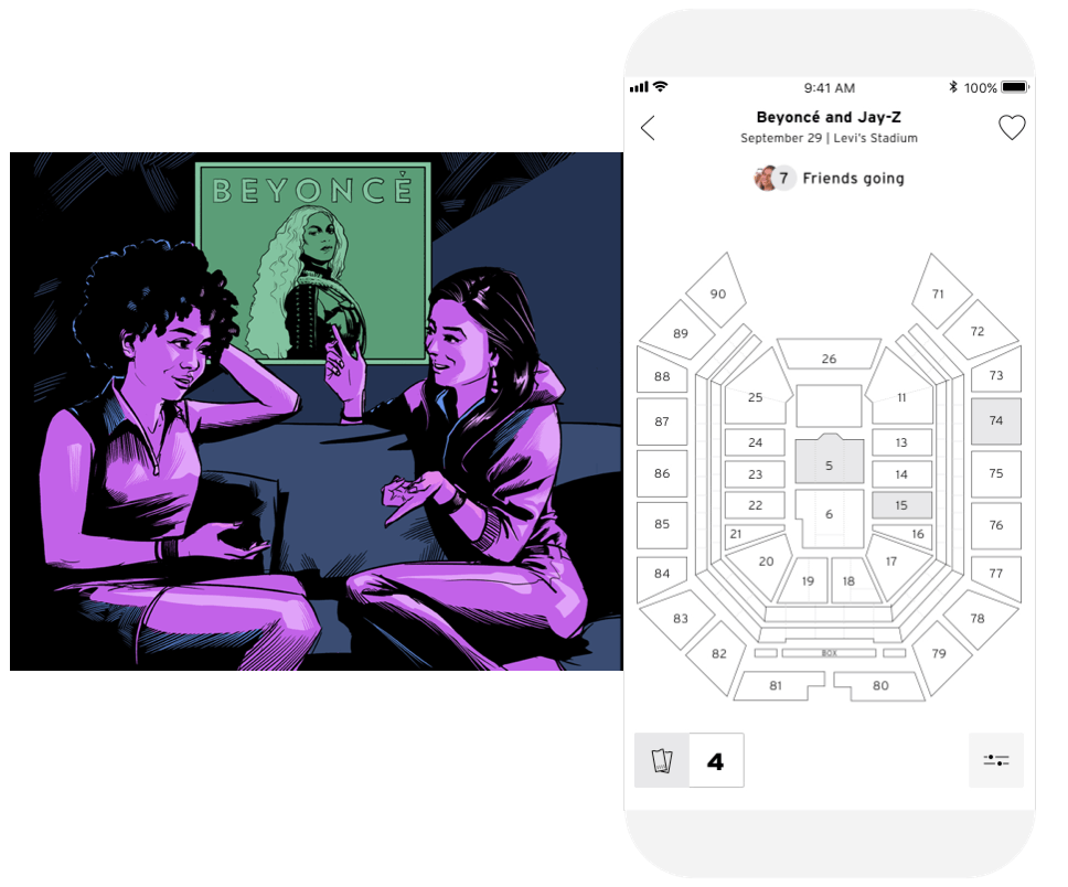 Danielle’s friend, Codie, is coming to town, and she wants to find a great event to do together. She selects her friends in the exploration tools and finds out that Codie, Jen, and Kate all have Beyonce on their wishlist.