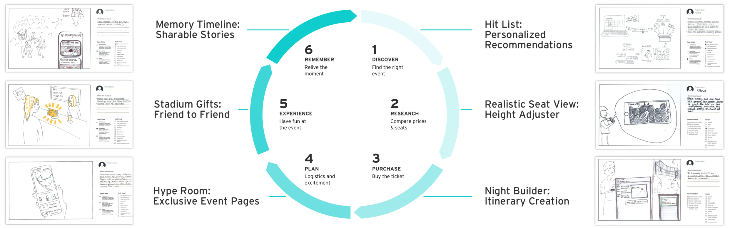 The selected ideas focused six areas across the event cycle to create a constant companion for the event goer that leverages social behaviors.