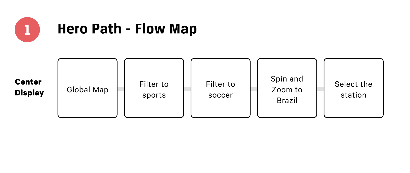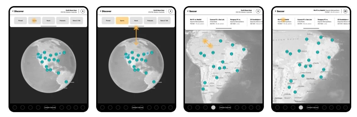 We conducted dual prototypes for fidelity and interactivity. Our design technologist coded a prototype that leveraged TuneIn APIs to connect to real-time radio stations. Partnering with the motion designer, we were able to create a 3D map interaction that would allow the globe to turn and have pinch/zoom capabilities.